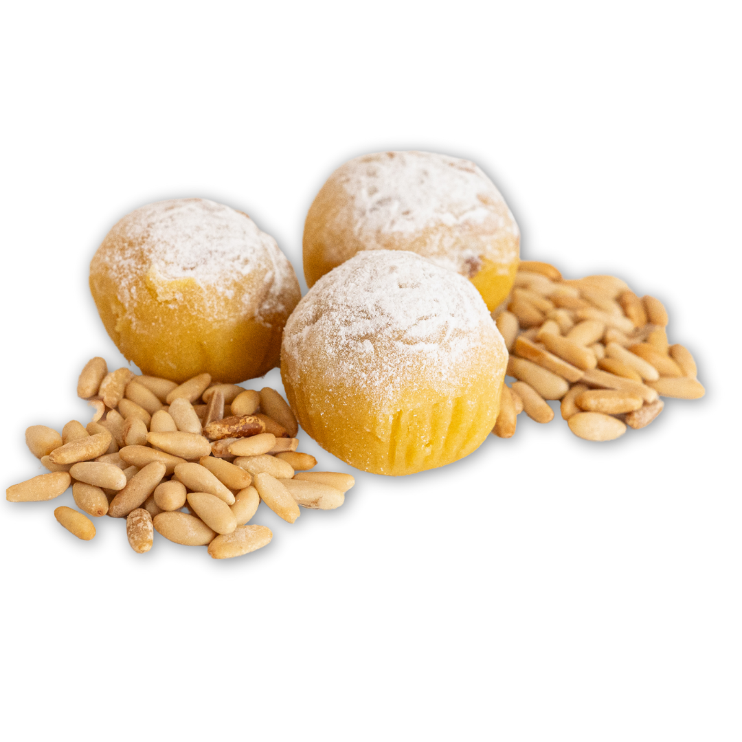 Ingredientes: Huevo, azúcar, almendras, piñones y harina de trigo.