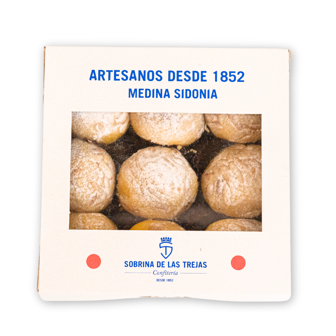 Se trata de un dulce realizado con yema de huevo cocida con azúcar y almendras. La masa se cubre con una capa de piñones tostados y azúcar glass . La caja es de 9 unidades.