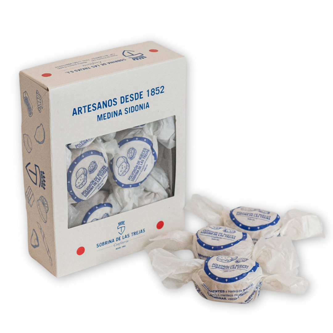 Los trocitos de nueces son el toque original de estos exquisitos polvorones realizados por la confitería Sobrina de Las Trejas de Medina. Las tradicionales almendras se sustituyen por este fruto seco, lo que le dan una especial personalidad.