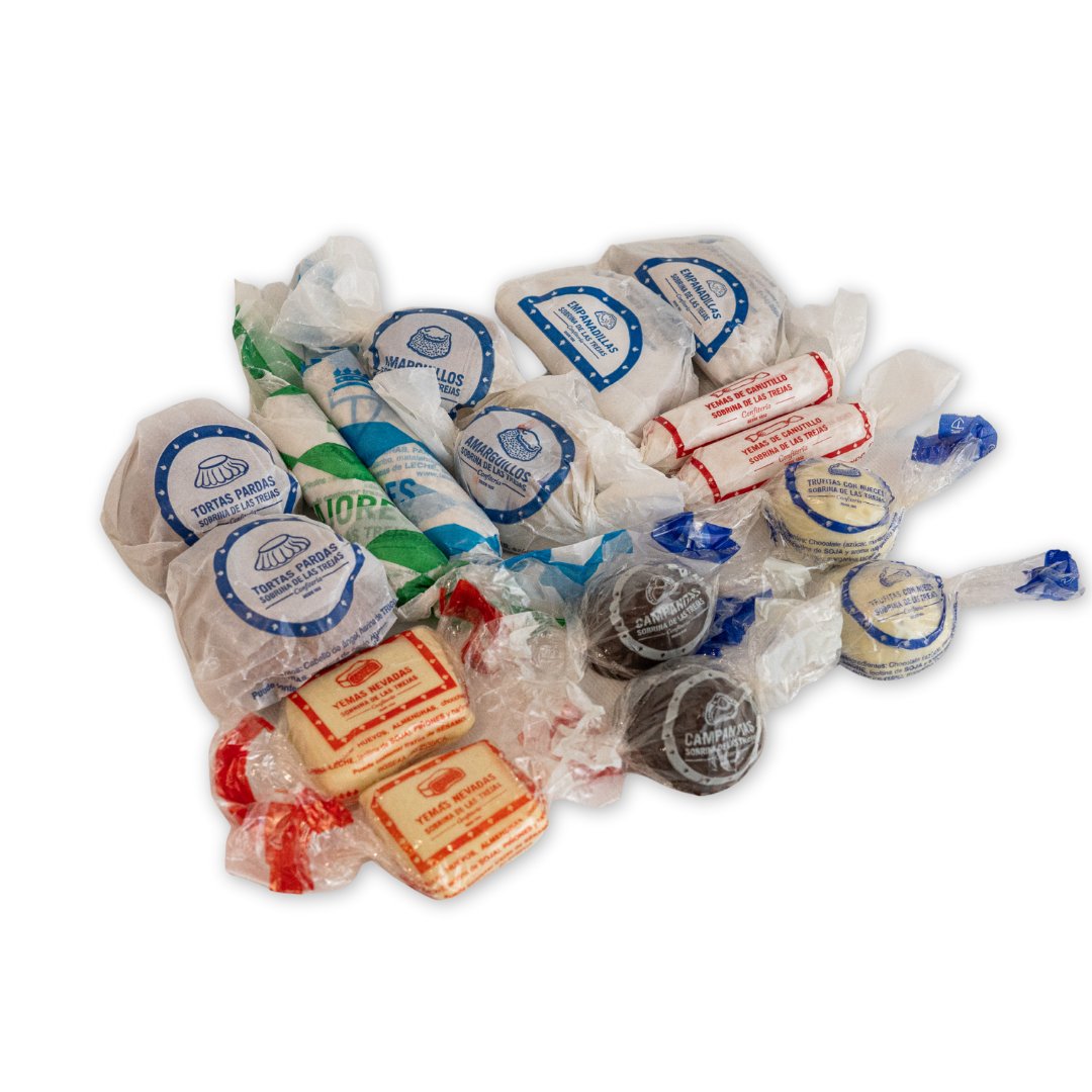 Contiene 3 alfajores, 2 amarguillos, 2 tortas pardas, 1 trufitas, 1 campanitas, 2 yemas de canutillo, 1 yemas nevadas , 2 empanadillas y 4 polvorones.