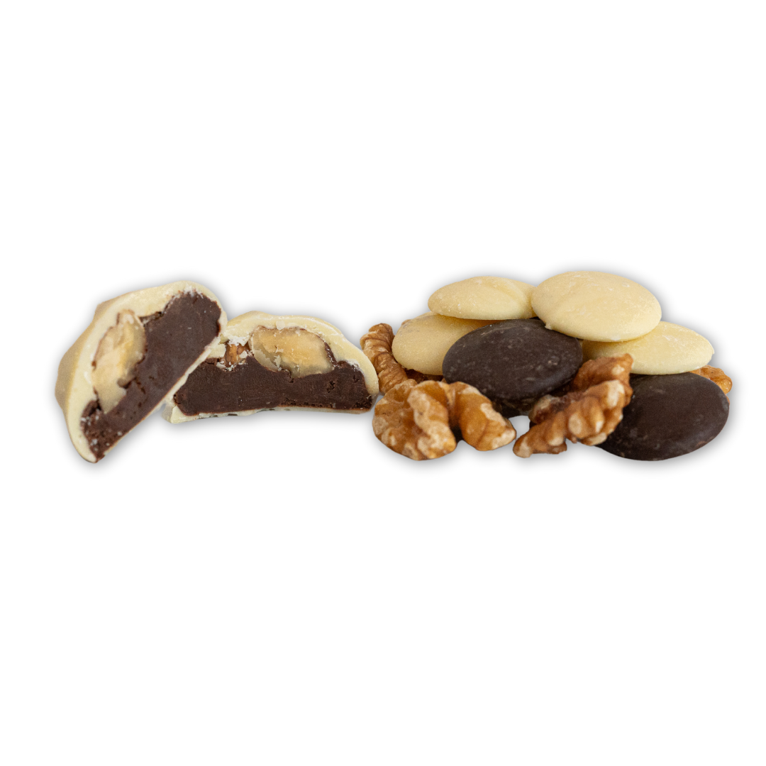 Cremosa ganache realizada con chocolates y coronada con una nuez, cubierta por una capa crujiente de chocolate blanco.